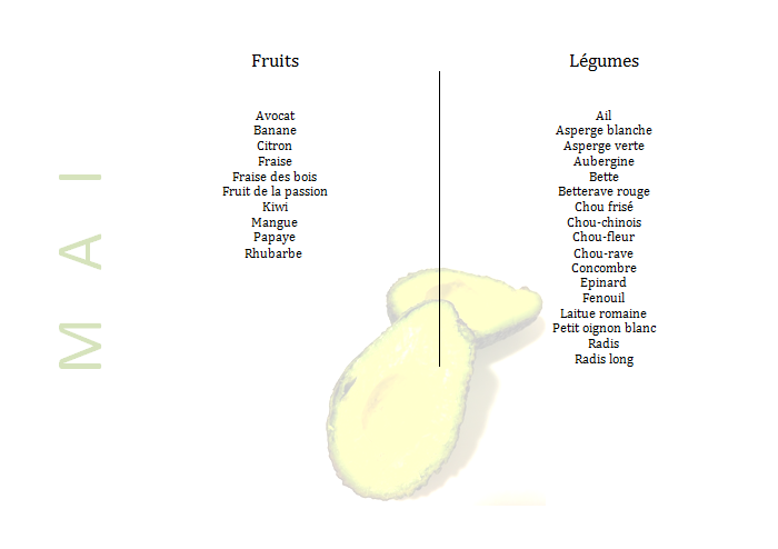 Mai Fruits et légumes du mois de mai 1 mai 2018 by Elise Leave a comment Fruits et légumes du mois de mai Share